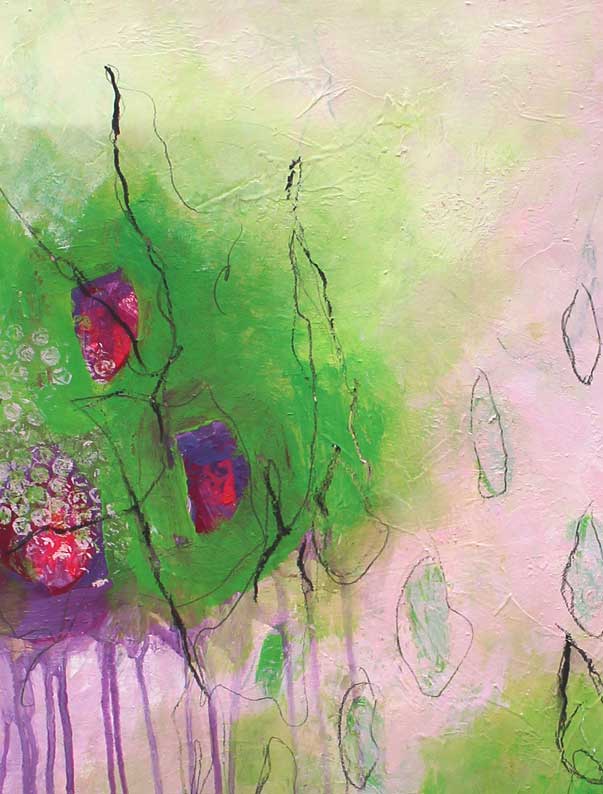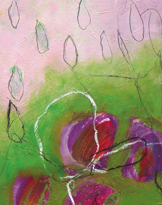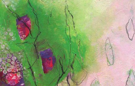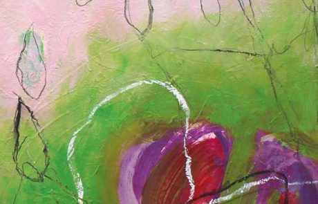 Zartes Grün erwacht, durchzogen von leuchtendem Rosa und ersten Blütenzeichen. Linien tanzen wie Halme im Wind, tragen das Versprechen des Frühlings in sich. „Auf der Frühlingswiese“ erzählt vom Aufbruch, vom stillen Erblühen und vom leisen Puls der Erde. Ein Moment des erneuten Erwachens – frisch, lebendig, voller Hoffnung auf ein fruchtbares Jahr.
