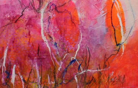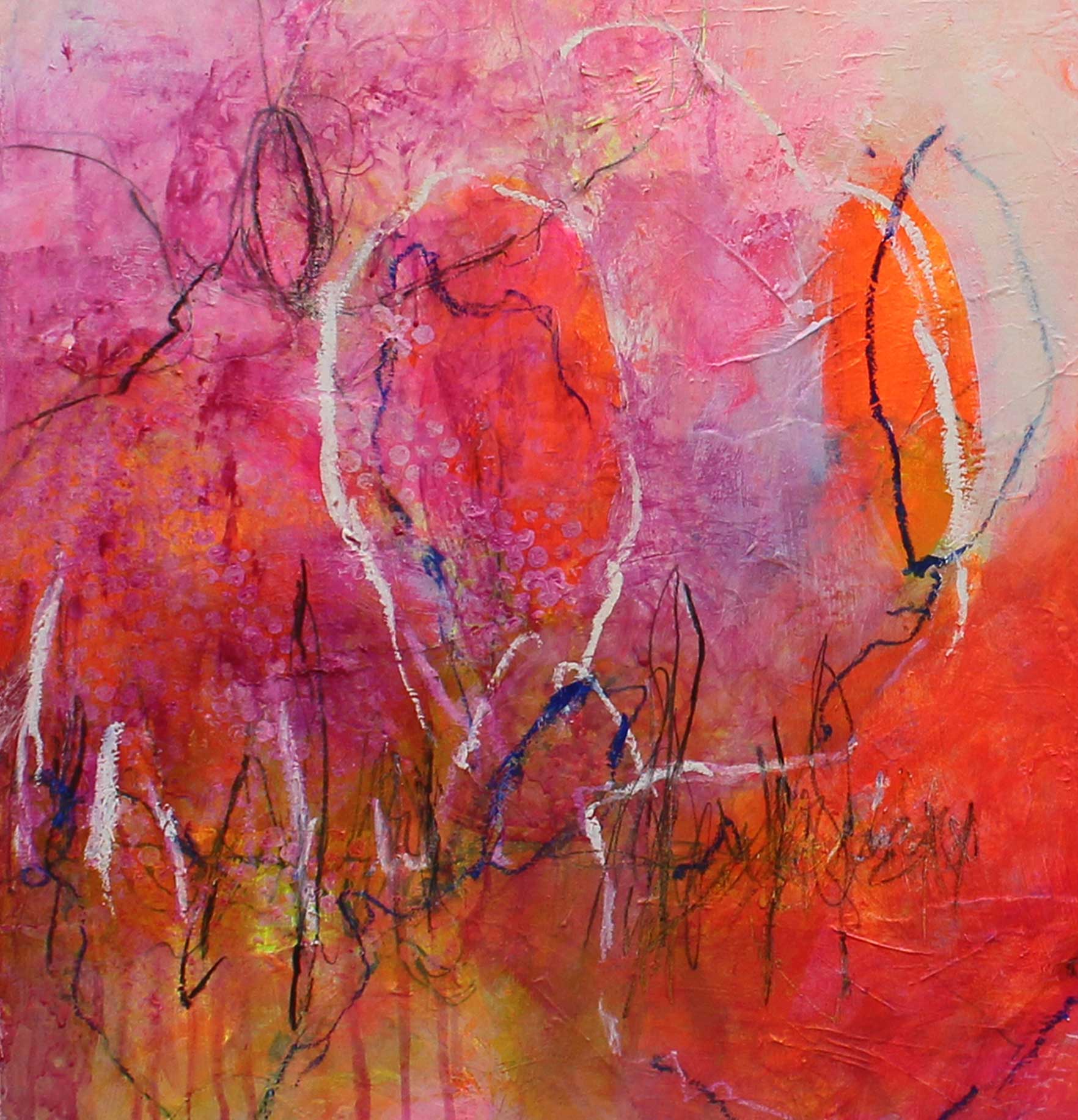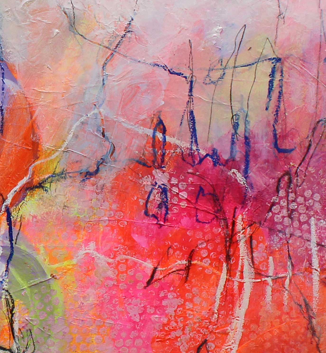 Kräftiges Strahlen breitet sich auf dem Bild aus – sanft, doch unaufhaltsam. Leuchtendes Rosa, Orange und Violett verschmelzen zu einem Tanz aus Licht und Wärme, unterstützt durch tanzende filigrane Linien auf dem Bild. Die Farben scheinen zu atmen, sich zu begegnen, sich zu verlieren. Ein Moment reiner Lebendigkeit – leuchtend, flüchtig, grenzenlos.