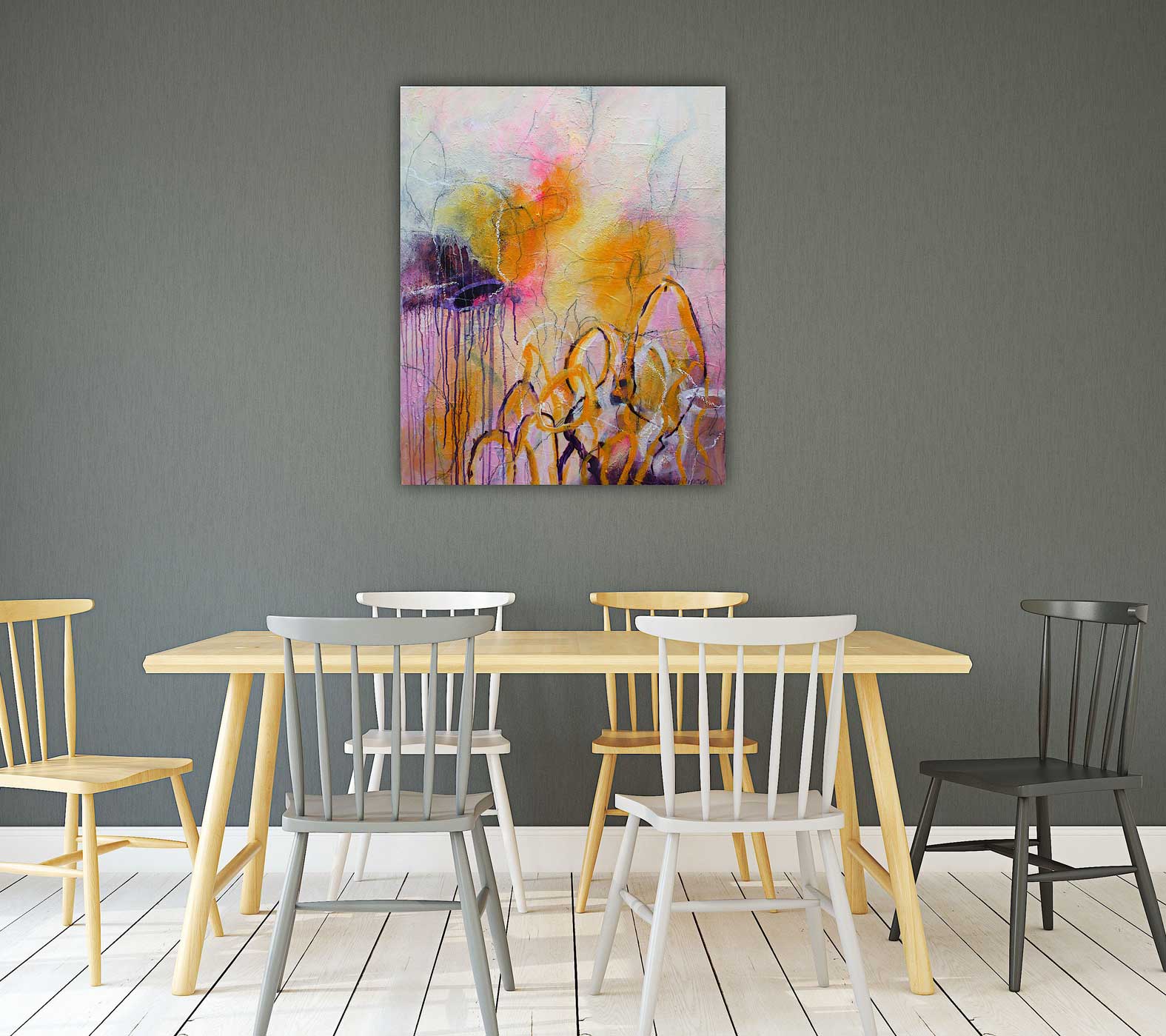 Auch die Intentionen und Anliegen, welche Sie mit dem Kunstwerk verbinden wollen, spielen eine große Rolle: Wollen Sie über das Kunstwerk Ruhe finden oder benötigen Sie mehr Energie und Kraft? Darf das Bild inspirierend sein? Oder eher in sich ruhend ? Welche Formen dürfen sich zeigen?