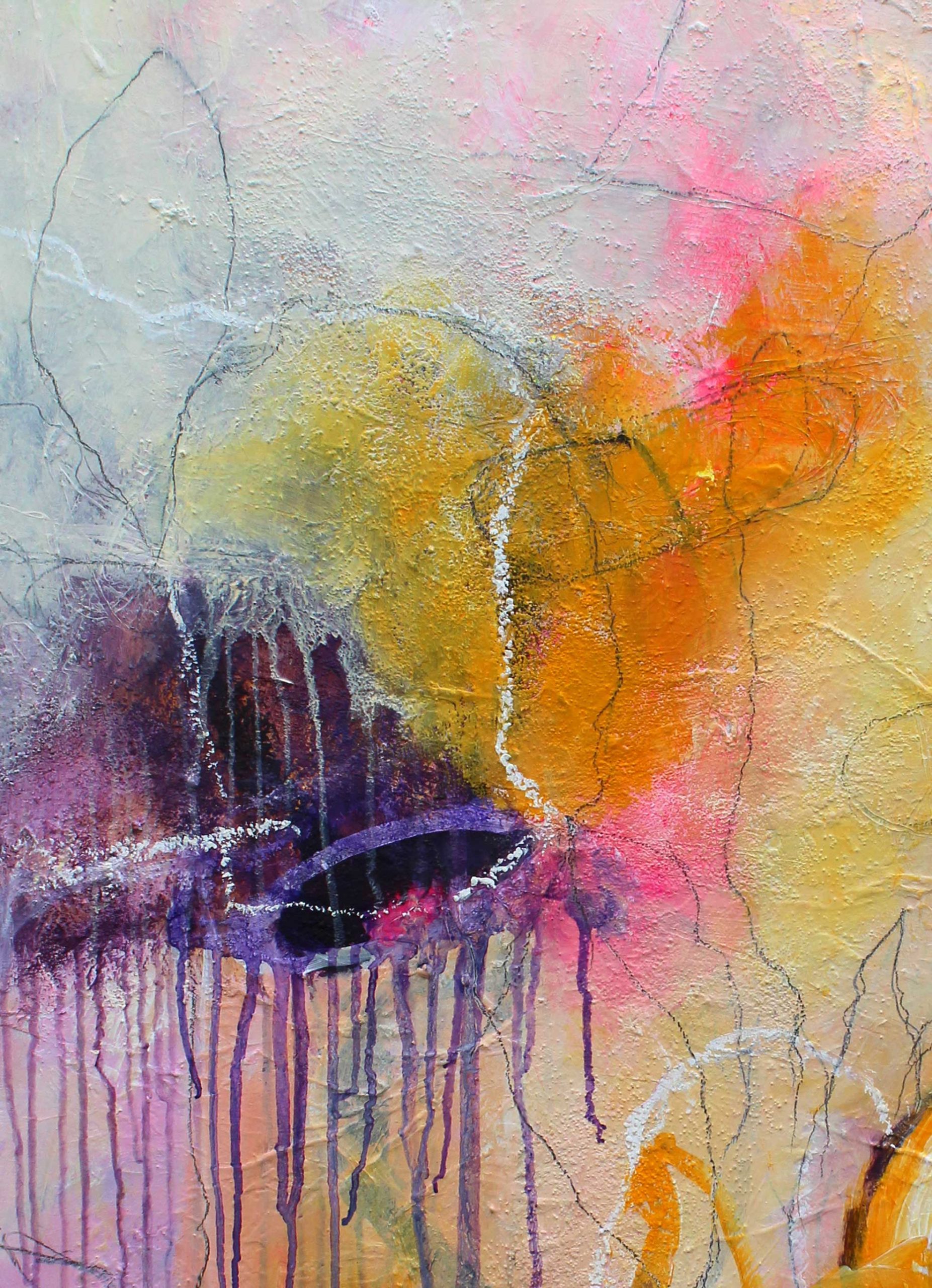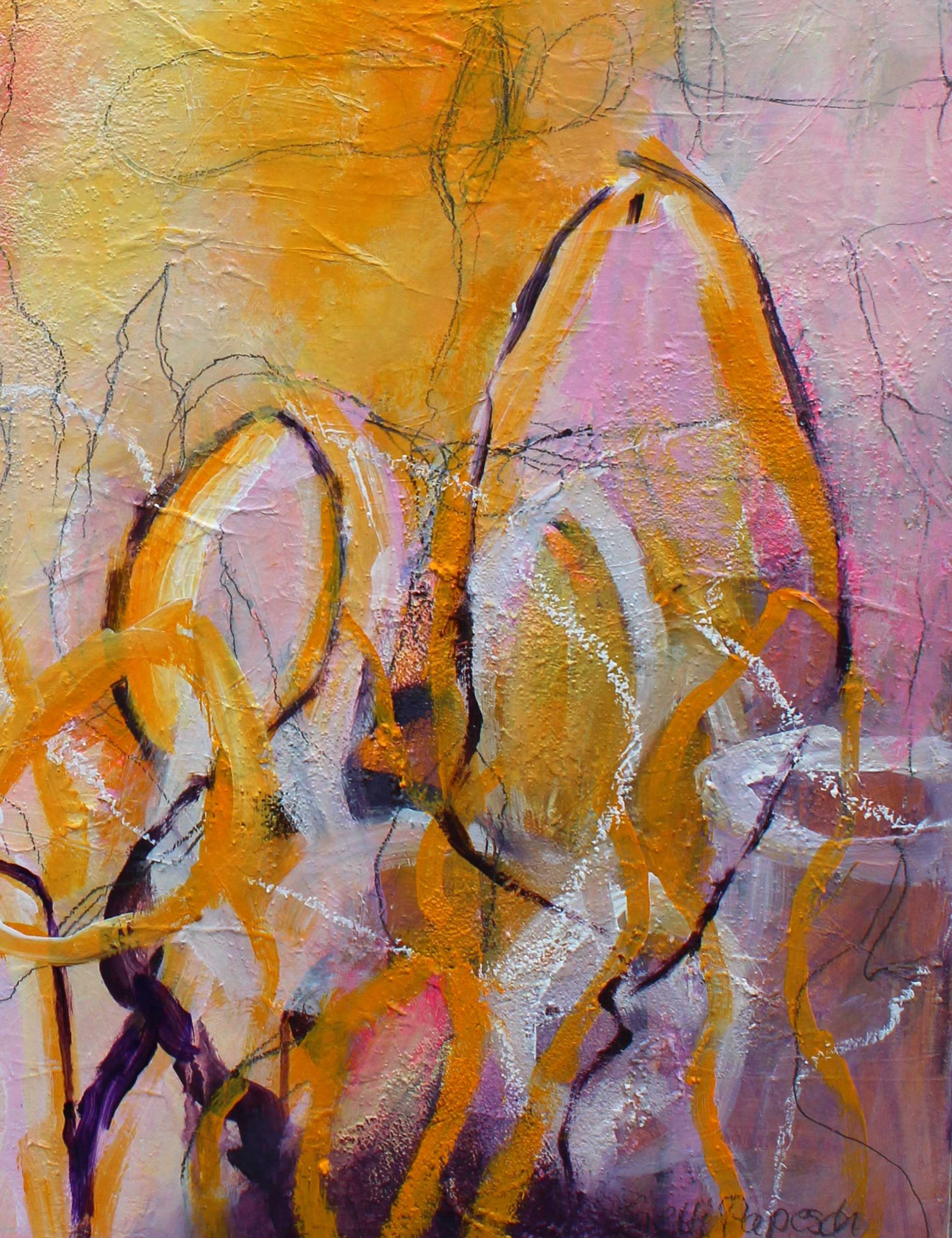 Die ersten Sonnenstrahlen am Morgen schaffen einen magischen Moment, welche die Natur in sanftes Licht tauchen. Die dunkellila Töne deuten die noch verbleibende Dunkelheit der Nacht an, während Rosa und Pink das heraufziehende Licht darstellen. Goldgelb leuchtet strahlend und symbolisiert die ersten Sonnenstrahlen. Zarte Linien wirken wie Lichtspuren, welche die Natur berühren und verleihen dem Bild eine subtile Dynamik. Die Kombination der Farben und der sanften, fließenden Linien schafft eine Atmosphäre von Frieden und Neubeginn, die das Erwachen der Natur im frühen Morgenlicht einfängt. Morgenzeit strahlt eine ruhige Energie aus, welche die Schönheit und Stille des Morgens festhält.