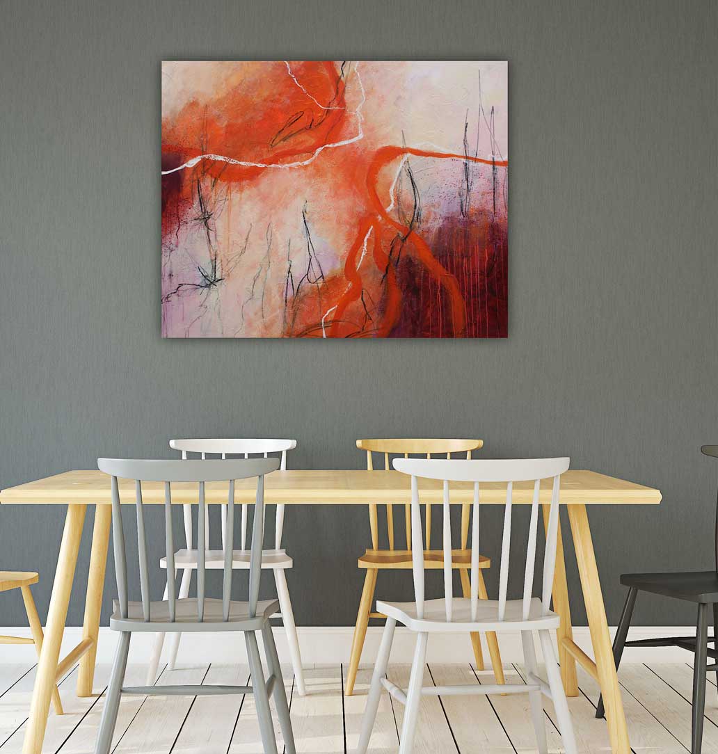 Gerne gestalte ich für Sie ein entsprechendes Kunstwerk. Dazu besprechen wir gemeinsam welches Format sich für den zukünftigen Platz des Bildes eignet, welche Farben und Materialien zum Einsatz gelangen und wie der abstrakte Malstil sein wird. Damit das Bild später gut zur Geltung kommt, beziehe ich die vorhandenen Farben im Raum, die Raumsituation und die Stimmung beim Entstehen der neuen Arbeit mit ein.