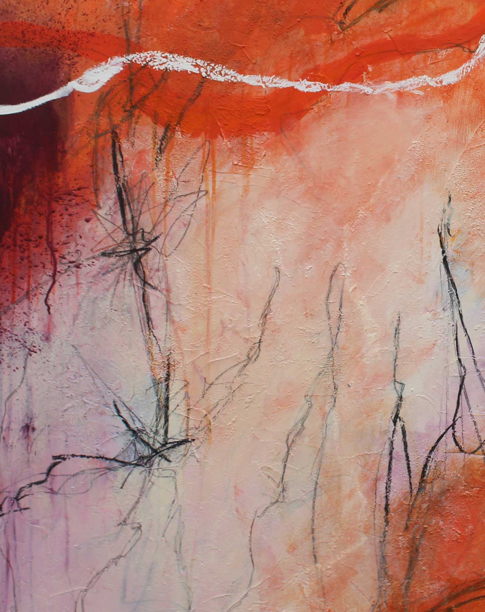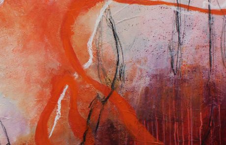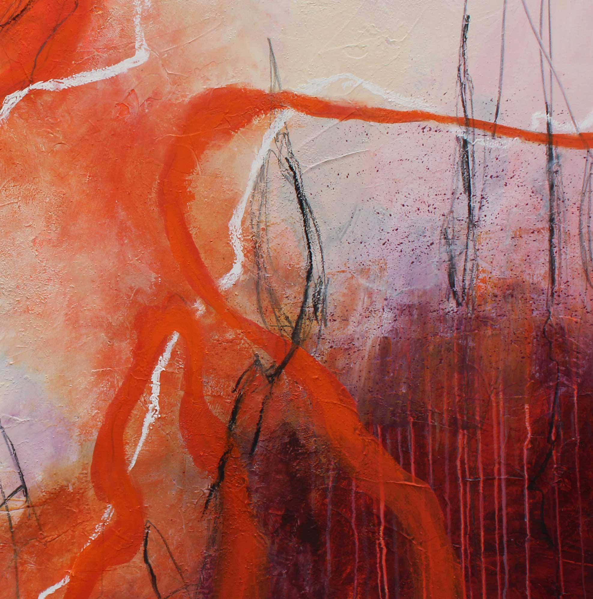 Ein Aufleuchten, ein Beben – Spannung liegt in der Luft. Linien zucken wie Blitze, tanzen durch glühende Rot- und Orangetöne. Farben treffen aufeinander, verschmelzen, lösen sich wieder. Die Arbeit fängt diesen Moment voller Energie ein, wie er wild, flüchtig und zugleich befreiend wirkt.